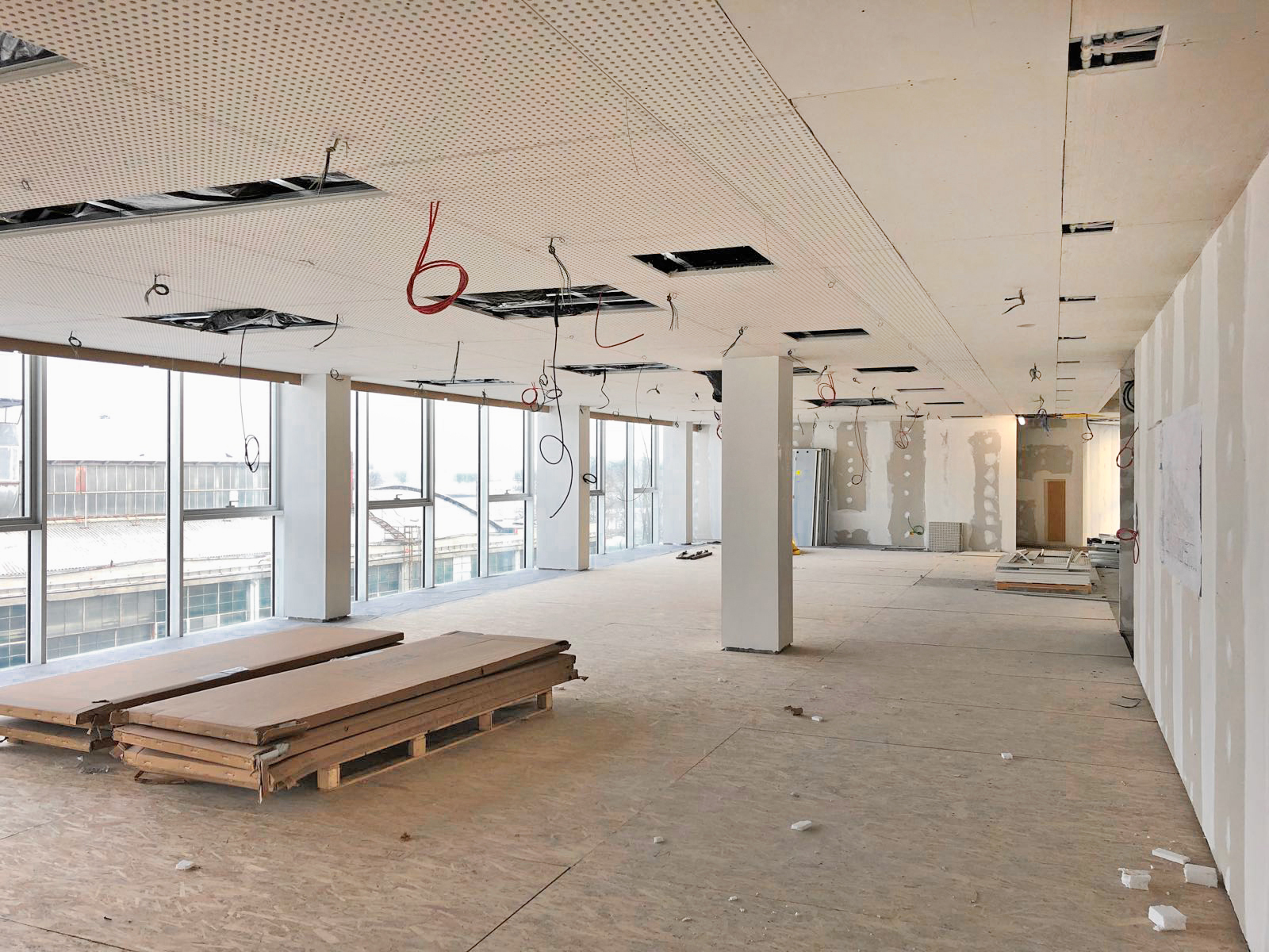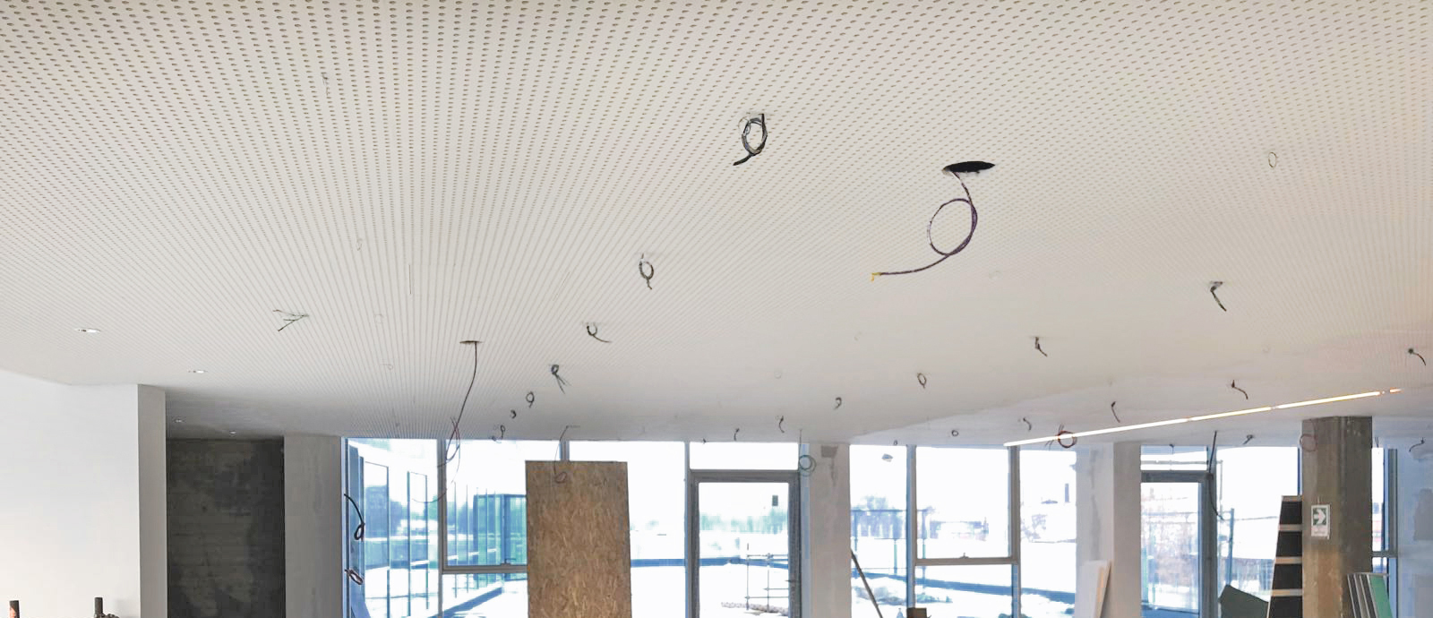 Stiamo parlando di un complesso edilizio di nuova costruzione che si sviluppa su una superficie complessiva di 17.000 mq, formato da una struttura adibita in parte a uffici (2.500 mq) e in parte ad attività di tipo industriale nel comune di Santena, vicino Torino. Noi ci siamo occupati della climatizzazione radiante a soffitto degli uffici (2.300 mq), con l’esplicita richiesta di lavorare su tre fronti: comfort termico, comfort acustico e risultato architettonico. Scoprite in questo webinar di approfondimento come abbiamo gestito l’installazione dei soffitti e il posizionamento di diffusori sonori, sensori di rilevazione e lampade..