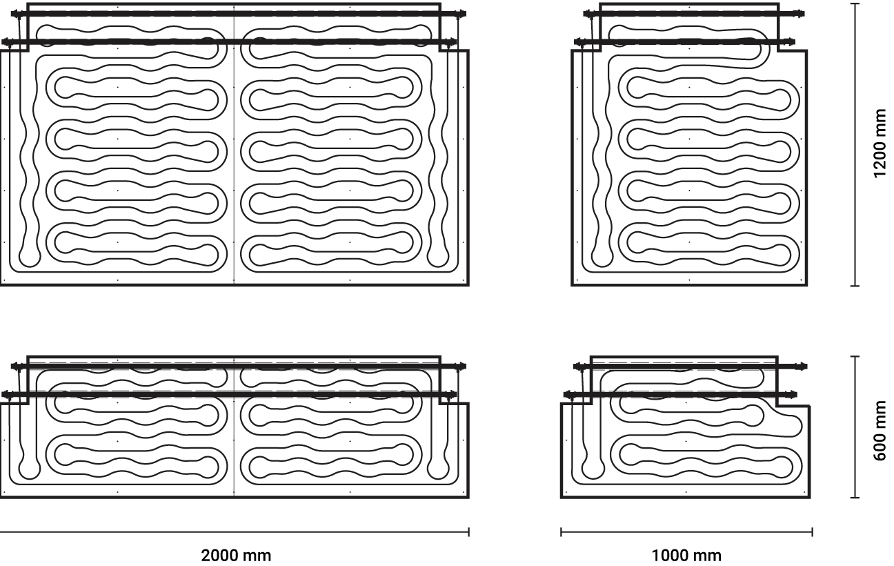 Pannello in cartongesso o cartongesso idro tipo DH1 (EN 520) con assorbimento d’acqua ridotto di spessore 15 mm prefinito per il montaggio a soffitto accoppiato a 45 mm di polistirene espanso sinterizzato con grafite tipo Neopor® o similare (λD = 0,031 W/mK secondo EN 13163), completo di tubazione a 5 strati in polietilene resistente alle alte temperature PE-RT del tipo II MidiX Plus (DIN 16833, EN 24033; ISO 22391; ISO 21003; EN 1264; EN ISO 11855; ISO 10508) con barriera all’ossigeno in EVOH nello spessore del tubo e permeabilità al vapore inferiore a 0,32 mg/(m²d) a 40 °C ed a 3,6 mg/(m²d) a 80 °C e pertanto rientrante nei limiti della norma DIN 4726 e EN 1264-4, caratteristiche di resistenza meccanica che lo rendono appartenente alle classi 4 e 5 a 6 bar (ISO 10508) per una vita prevista di 50 anni; tubazione MidiX Plus 10 x 1,3 mm disposta a serpentina ad andamento serpeggiante con percorso ottimizzato per aumentare l’area di sicurezza per il fissaggio e interasse 5,5 cm. Nello strato di isolamento sono presenti due barre in tubazione multistrato in PE-RT tipo II (PE-RT II/AL/PE-RT II) 20 x 2 mm ( EN ISO 21003) necessarie per il collegamento idraulico dei pannelli con il collettore di distribuzione. I pannelli con dimensioni 1200 x 2000 mm e 600 x 2000 mm sono divisibili a metà. La tubazione è dotata di raccorderia speciale Click&Safe in PPSU premontata del tipo a stringere sulla tubazione tramite anelli in PPSU per un fissaggio rapido tra i pannelli.