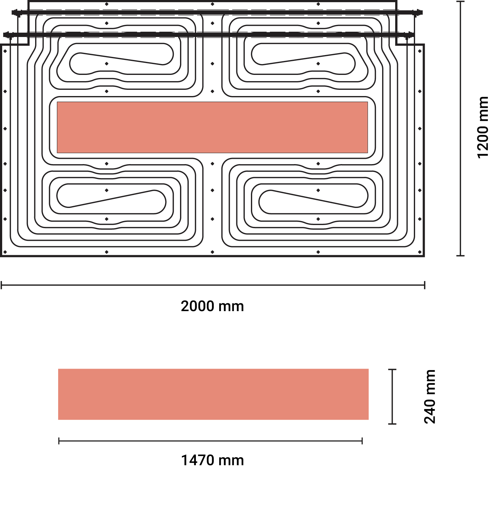 Pannello in cartongesso o cartongesso idro tipo DH1 (EN 520) con assorbimento d’acqua ridotto di spessore 15 mm prefinito per il montaggio a soffitto accoppiato a 45 mm di polistirene espanso sinterizzato con grafite tipo Neopor® o similare (λD = 0,031 W/mK secondo EN 13163), dotato di uno spazio appositamente studiato e ricavato nella zona centrale (240 x 1470 mm) per l’installazione impiantistica, completo di tubazione a 5 strati in polietilene resistente alle alte temperature PE-RT del tipo II MidiX Plus (DIN 16833, ISO 24033, ISO 22391, ISO 21003, EN 1264) con barriera all’ossigeno in EVOH nello spessore del tubo e permeabilità al vapore inferiore a 0,32 mg/(m²d) a 40 °C ed a 3,6 mg/(m²d) a 80 °C e pertanto rientrante nei limiti della norma DIN 4726 e EN 1264-4, caratteristiche di resistenza meccanica che lo rendono appartenente alle classi 4 e 5 a 6 bar (ISO 10508) per una vita prevista di 50 anni; tubazione MidiX Plus 10 x 1,3 mm disposta a serpentina attorno allo spazio centrale di dimensioni 1470 x 240 mm; sulla superficie del pannello è presente un disegno laser che indica la posizione del tubo; tubazione completa di anelli per il collegamento di collettori di distribuzione. Finitura liscia. Il pannelo è divisibile a metà. Raccorderia speciale Click&Safe in PPSU premontata del tipo a stringere sulla tubazione tramite anelli in PPSU, per fissaggio rapido tra pannelli.